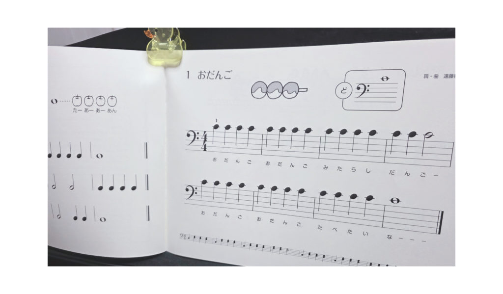 左手の練習に入った生徒さん。大人から見ると、とても簡単な楽譜で次のレッスンまでに弾かなくても、弾ける曲ですね!